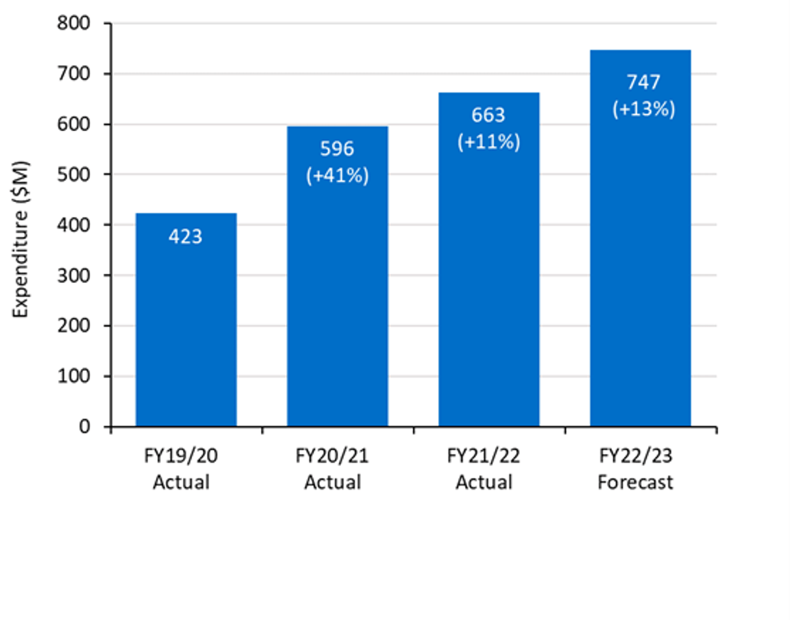 - Targeted expenditure grew from $423M in FY19/20 to $747M in FY22/23.