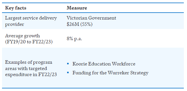 - Just over half of the department’s targeted expenditure is delivered by the Victorian Government. ‘Other organisations and statutory Aboriginal representative bodies’ services are mostly delivered through Traditional Owner Corporations.